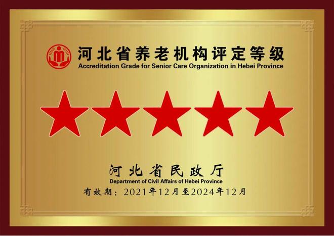 2019年4月,按照《河北省养老机构星级评定管理办法(试行)》和《河北省养老机构星级评定细则(试行)》,经各地民政局初审、第三方机构评审、省厅组织评审结果核查、省养老机构星级评定领导小组审定,燕达金色年华健康养护中心被评定为五星养老机构。