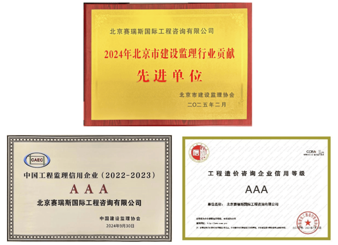 中冶京诚赛瑞斯凭借卓越的项目管理水平与技术实力,累计斩获22项国家“建设工程鲁班奖”、9项“詹天佑奖”、24项“国家优质工程”奖、7项“全国市政金杯示范工程奖”、5项“全国装饰工程奖”、15项“金钢奖”,获得北京市长城杯及省部级奖500余项,连续多年获评北京市监理协会“先进建设监理单位”、中国建设监理协会“先进监理企业”,信用等级保持AAA级,成为行业内的“荣誉标杆”。